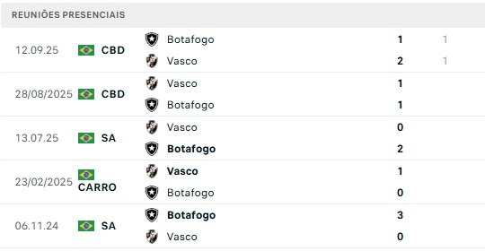 Nos últimos cinco confrontos diretos, o Botafogo venceu duas vezes e o Vasco, uma.