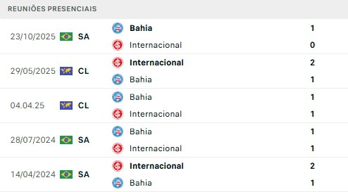 Nos últimos cinco confrontos diretos, o Internacional venceu duas vezes e o Bahia uma vez.