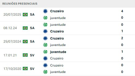 Nos últimos 5 confrontos diretos, o Cruzeiro venceu três vezes e o Juventude uma vez.